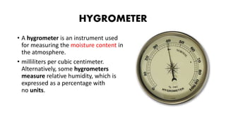Hygrometers are instruments used for measuring humidity. A psychrometer or a hygrometer are weather instruments used to measure relative humidity. However absolute humidity can be pinpoint the exact amount of humidity in.